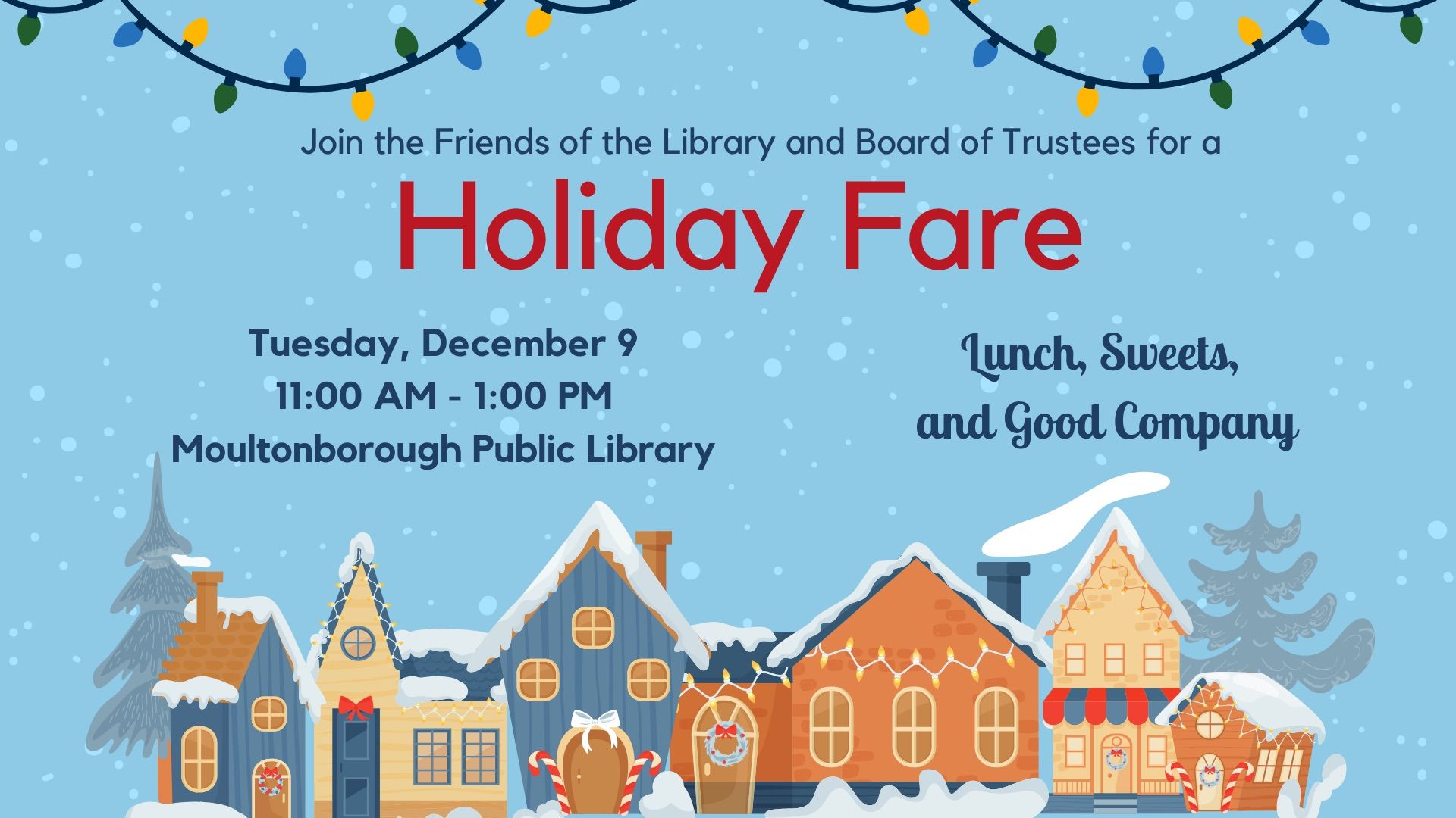 Join the Friends, Trustees, and Librarians of the Moultonborough Public Library for a cozy and cheerful Holiday Fare! This relaxed community event invites you to enjoy a light lunch, sweet treats, and warm conversation in a festive seasonal setting.