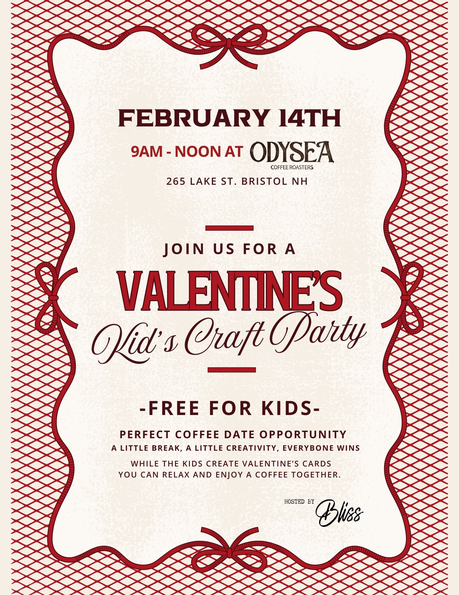 Kids crafting. Parents sipping coffee. Everyone wins! ☕🎨Join us for a Valentine’s Kid’s Craft Party at Odysea Coffee Roasters, hosted by Bliss NH. Drop in anytime between 9 AM and noon and let the kids get creative making Valentine’s crafts while parents enjoy a relaxing coffee break.