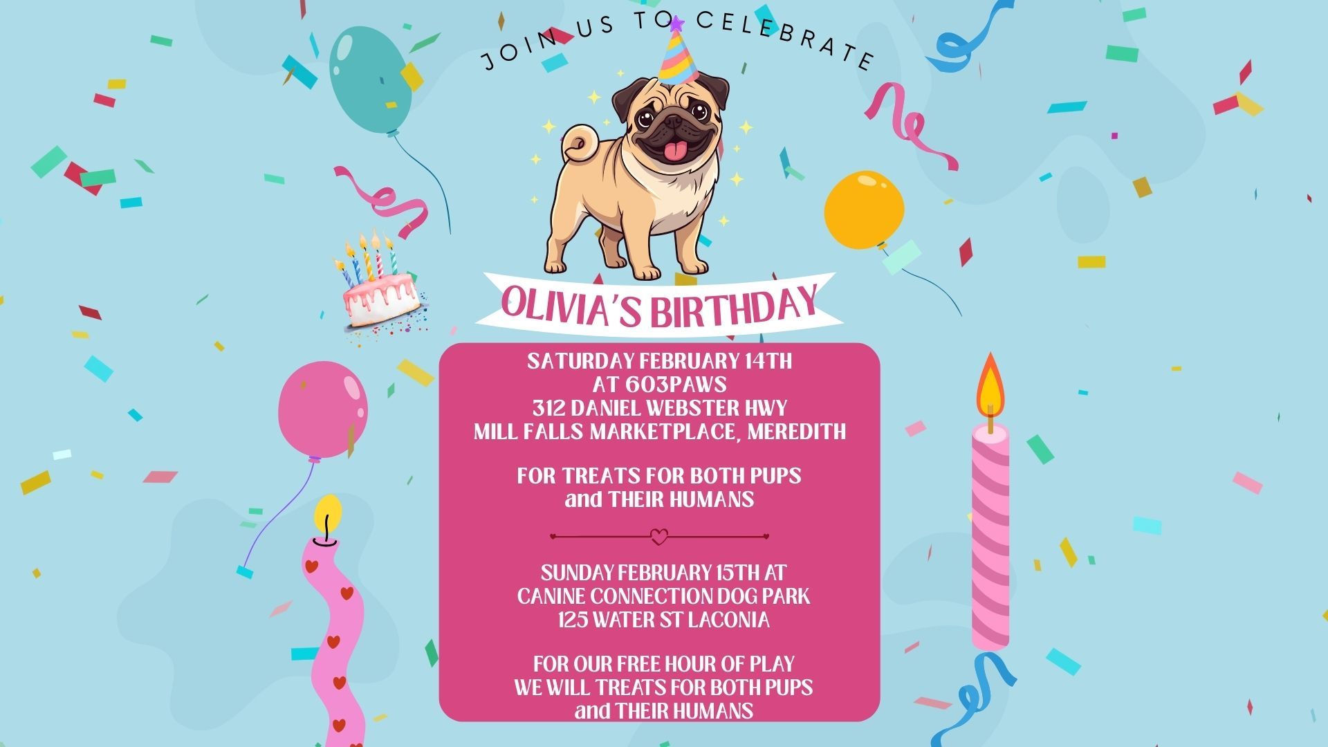 🐶🎉 Olivia’s Birthday Play Hour at Canine Connect 🎉🐾📍 Canine Connect, 123 Water St., Laconia, NH🗓 Sunday, February 15🕒 3:00 – 4:00 PM📣 Public · Dog-Friendly · Open Play