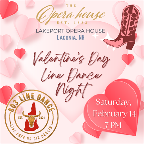 💖👢 Valentine’s Day Line Dance Night 👢💖📍 Lakeport Opera House, Laconia, NH🗓 Saturday, February 14, 2026🕖 7:00 PM – 10:30 PM📣 Public · Dance Night · No Partner Needed