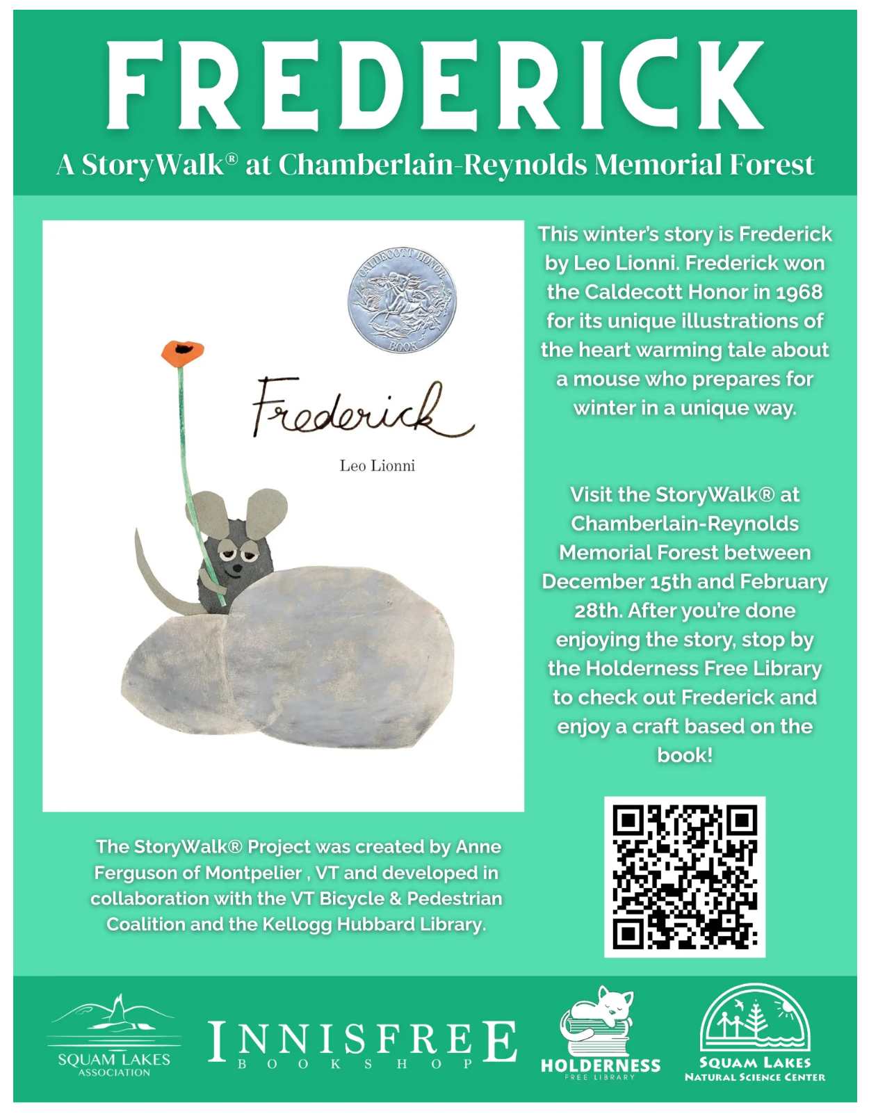 Enjoy a magical winter reading adventure in the woods with this season’s StoryWalk® feature, Frederick by Leo Lionni. This beloved Caldecott Honor-winning book (1968) tells the heartwarming story of a thoughtful little mouse who prepares for winter in his own unique way.
