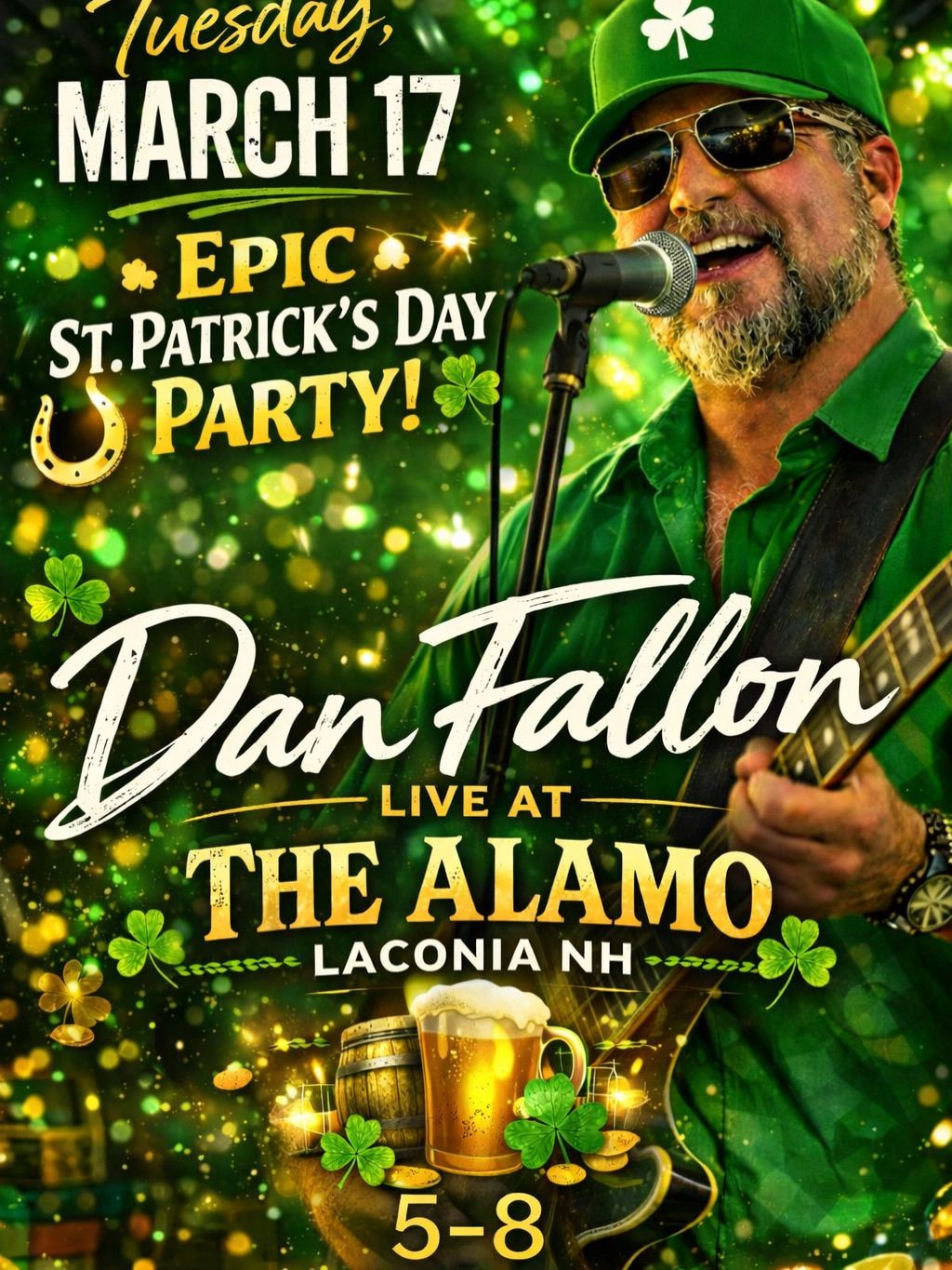 Celebrate St. Patrick’s Day with an evening of music, food, and festive fun at The Alamo in Weirs Beach! Enjoy live music by Dan Fallon from 5–8 PM, featuring sing-alongs, crowd favorites, and plenty of Irish-inspired energy.