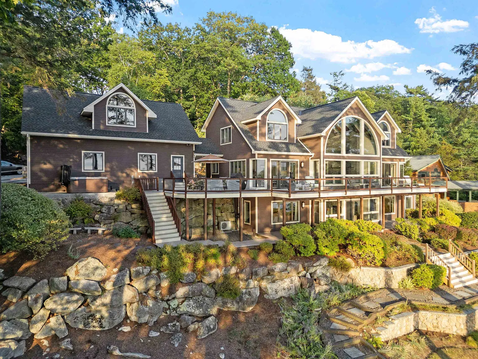 Sitting atop 156' of Lake Winnipesaukee shoreline, the southwest facing home is perfectly positioned to embrace the long sunset views down the cove, optimizing the sun year-round, with a floor plan that creates a natural interaction between the home and the outdoors. The heart of the home, a large sun filled great room is open to the kitchen and dining area, allowing free-flowing informality amongst the spaces accented by walls of windows. The expansive lakeside deck is perfect for morning coffees or watching family swim and play below. A secluded owners suite on the top story includes a loft, walk-in closet and full bathroom with jacuzzi. The lower level offers a spacious family room off a large bedroom overlooking the lake. Lakeside enjoy deep water off your U-shaped docking system with boat lift and canopy as well as a seasonal jet ski dock. A shoreline bluestone patio provides for entertainment right along the lakes edge. Enjoy being close by boat to all the destination boating yet you get calmer waters with the protection from Stonedam Island across the way, which is mostly all protected, undeveloped land. With a two-car detached garage with an unfinished space above, you have great storage space or future living space. This home embraces the lake from so many venues and affords its owners a lifestyle that is truly special.